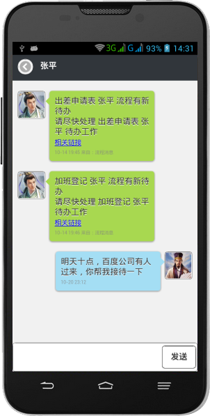 奥科即聊的即时消息,可用于系统下发消息通知、企业员工之间传达即时消息。