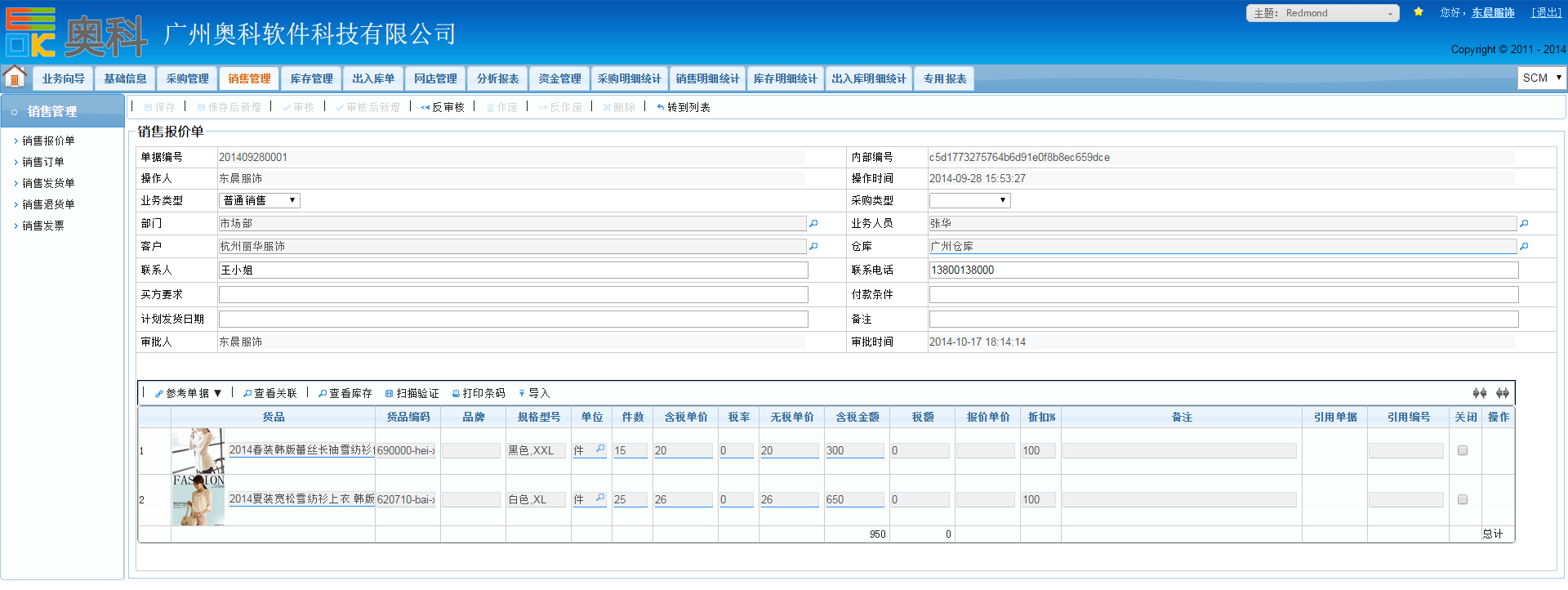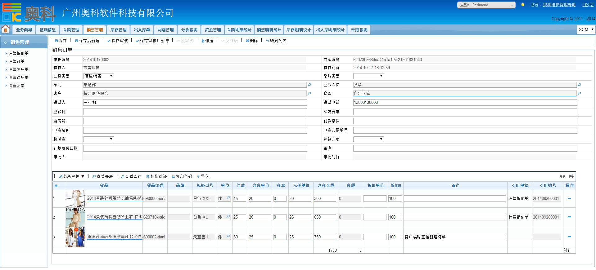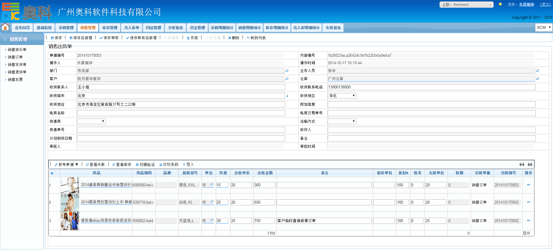 奥科供应链的销售管理主要包含了“销售报价”、“销售订单”、“销售发货”、“销售出库”、“销售退货”、“销售发票”等功能: