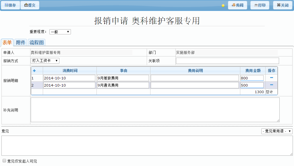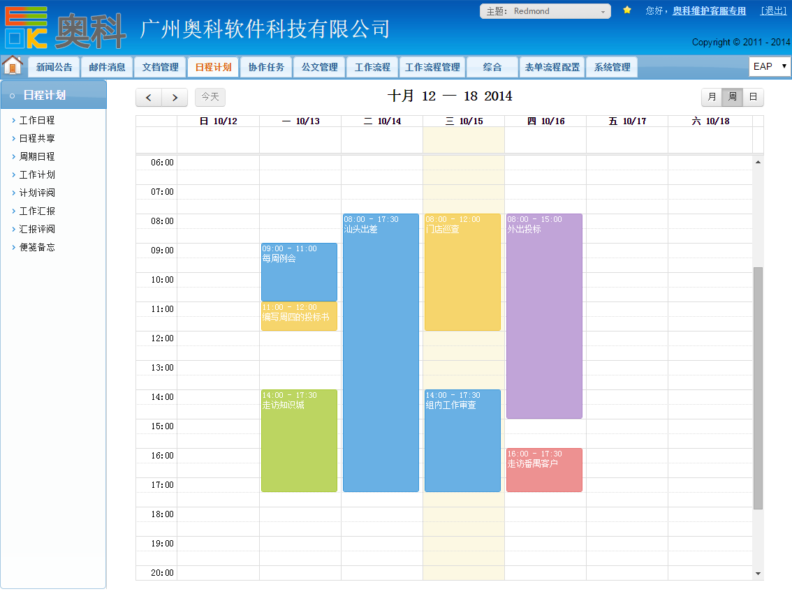 究竟能做些什么奥科OA协同办公平台面向全国企业提供在线使用服务。究竟奥科OA协同办公平台能为这些企业做些什么呢?首先,我们可以肯定的:考勤异常处理、网上报销、日程计划汇报、邮件消息、名片印刷申请、请假申请、出差申请、加班登记、会议安排、用车申请、工作交办、外出登记、借支申请、请款付款申请、发票申请等日常工作,都可以由奥科OA协同办公平台来协同完成。其次,奥科OA协同办公平台还提供强大的 自定义智能表单功能 ,可以满足企业更深入更高级的数据在线信息化的要求。 对于部分中小企业来说,有些流程是根本不需要走信息化系统来完成的。但是,总是有些流程,老板希望通过信息化系统来协同提高工作效率。比如:企业只要有考勤制度(比如指纹、打卡考勤),那总需要 考勤异常处理 吧;企业只要有月度、季度费用报销,那 网上报销 可以派上用场吧;企业只要有须安排和管理的工作任务,可共享可评阅的 日程计划汇报 应该是个不错的选择吧;其他的诸如邮件消息、名片印刷、请假申请、出差申请等等,也都是企业的常见功能以及常用流程,企业也可按需使用。 个别中小企业的老板,可能只希望那么两三条流程通过信息化系统来规范管理完成,但要花钱购买OA系统,又划不来,所以为难了。况且花了钱,买回来还不一定好用,所以更为难了。奥科OA协同办公平台为企业提供在线使用服务,专业的功能模块,让企业 低成本、零部署、零维护 直接在线使用OA系统,真正做到 低投入而大产出 协助企业成长。 考勤异常处理考勤异常处理作为最常用的企业流程处理之一,其流程大致如下: 一、从考勤机中导出考勤异常数据,按格式导入本系统中(本系统的导入格式基本与大部分考勤机的异常导出格式一致,如需具体考勤机型号,可联系奥科软件)。 二、一键发起异常处理流程。流程直接读取异常数据,并将领导审批的每条处理结果直接回写到异常数据,无需传统的人工邮件通知、领导邮件审批、最后人工合并处理结果。 简单两步操作,10天后(假如行政上规定10天内处理好考勤异常),导出需要惩罚(比如缺勤扣工资)的处理结果,交人力部门或者财务部门处理。 导入导出界面: ![]() 流程界面: ![]() 网上报销网上报销流程作为最常用的企业流程之一,其流程大致如下: 一、企业员工按照公司规定结合自身实际情况,通过网上报销单,提出报销申请。 二、提交流程经过部门审批、财务部审批(具体流程可调整),轻松即可完成网上报销。 流程界面: ![]() 日程计划企业日程计划与手机端日程安排或者PC端计划安排最大的区别是:企业的日程计划,是可以指定共享,是可以反馈评阅的,是可以监督执行,是可以最终形成汇报的,而这些都是手机独立APP或者PC独立程序无法做到的。 具体界面: